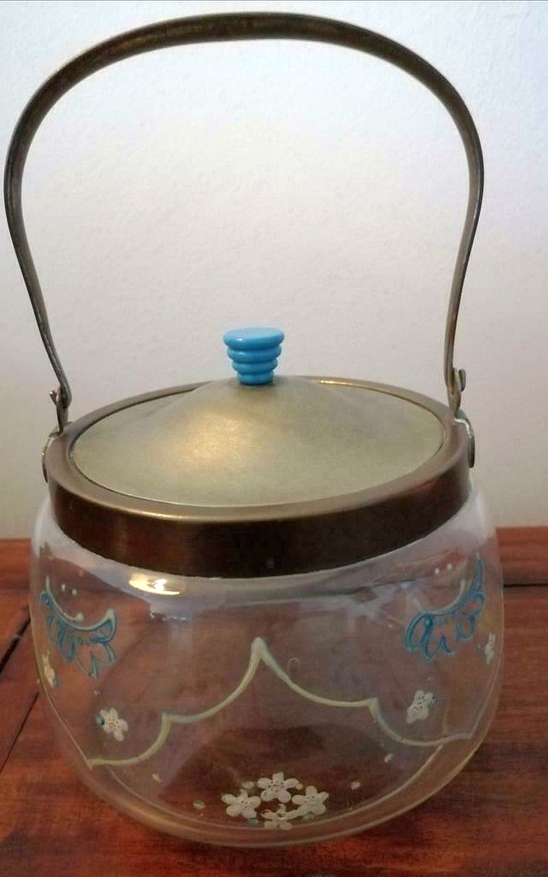 Het glas is versierd met (emaille?) bloemetjes en het deksel heeft een blauw (bakelieten?) knopje.